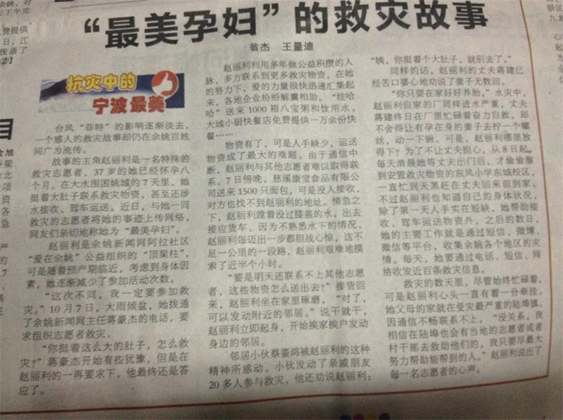 故事的主角趙麗利是一名特殊的就在志愿者,37歲的她已經懷孕八個月。在大水圍困救城的7天里,她挺著大肚子聯系救災物資,甚至還涉水接收、駕車運送。救災的數天里,盡管始終忙碌著,可是趙麗利心頭一直有著一份牽掛。她父母的家就在受災最嚴重的陸埠鎮,因通信不暢聯系不上。“沒關系。我相信在陸埠也會有當地的志愿者或者村干部去救助他們的。我只要盡最大努力幫助能幫到的人。”趙麗利說出了每一名志愿者的心聲。近日,與她一同救災的志愿者將她的事跡上傳網絡,網友們親切地稱她為“最美孕婦”。